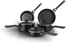 This 9-piece kitchen cookware set includes essential pieces like a 26cm frying pan, two saucepans with lids (18cm and 20cm), a 24cm stockpot with lid, and a 28cm frying pan with lid, covering everyday cooking needs.